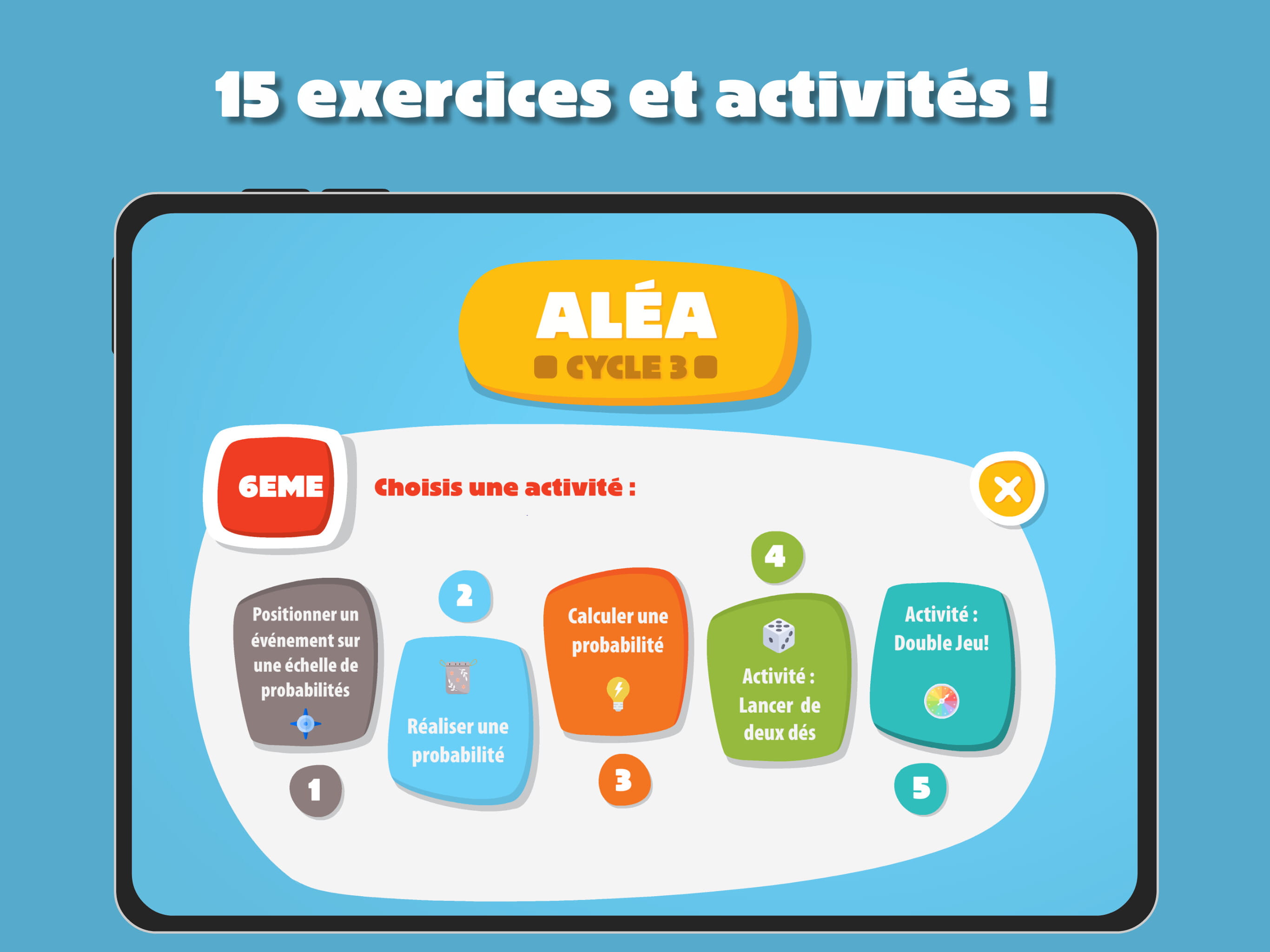 Alea comporte 15 exercices ou activités, réparties sur le cycle 3 :
