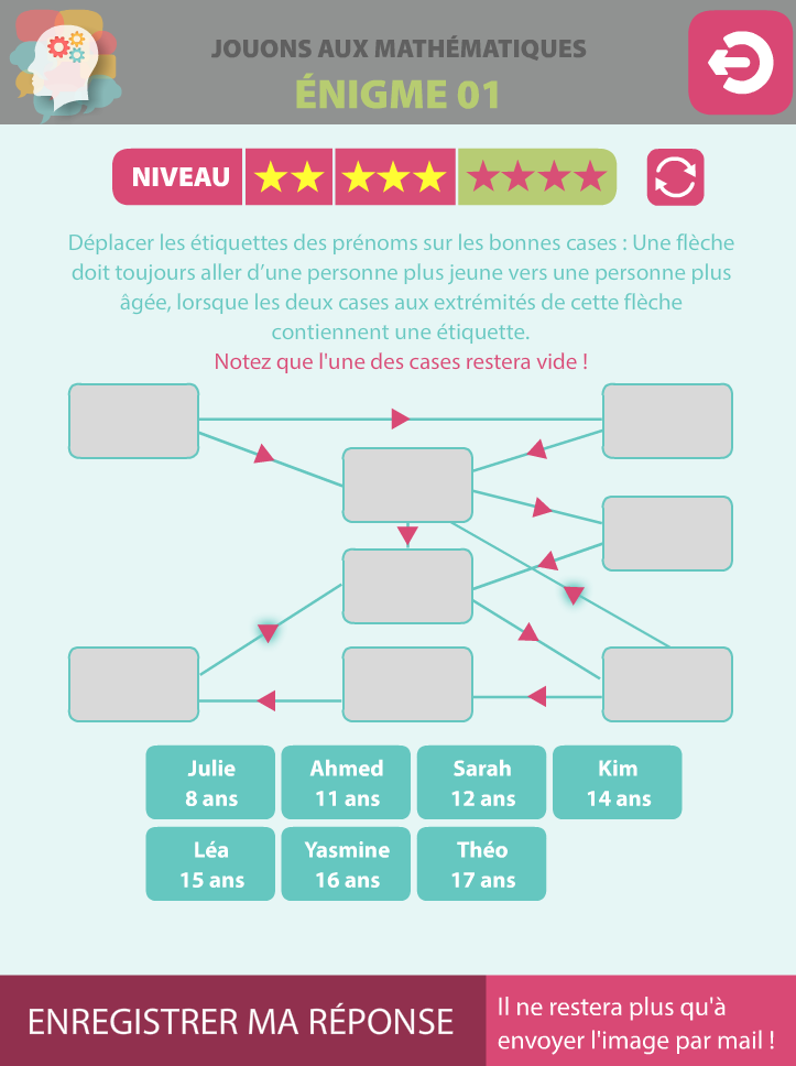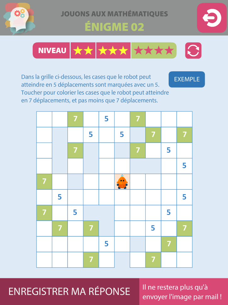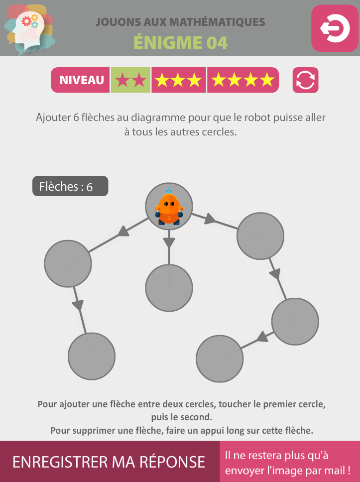 Cinq énigmes à résoudre, de difficulté croissante, déclinées chacune en 3 niveaux. Les réponses, sous forme de captures d'écran, sont à envoyer au professeur référent de l'action (qui n'est pas l'auteur de l'application !).