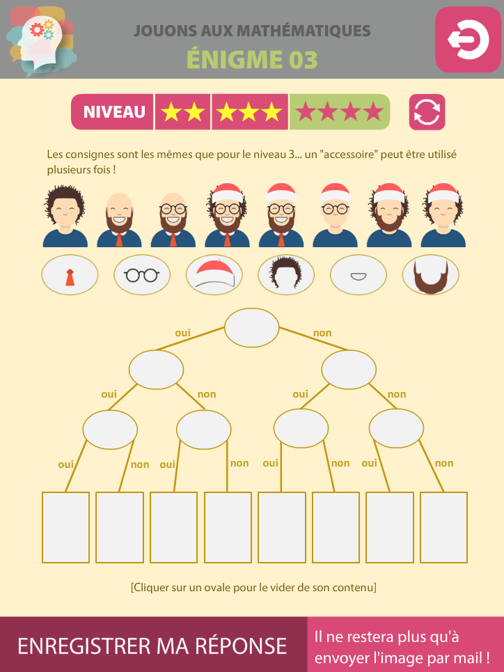 L'application est constituée de 5 énigmes (une pour chaque jour) déclinées en trois niveaux de difficultés, et est utilisable aux cycles 3 et 4.