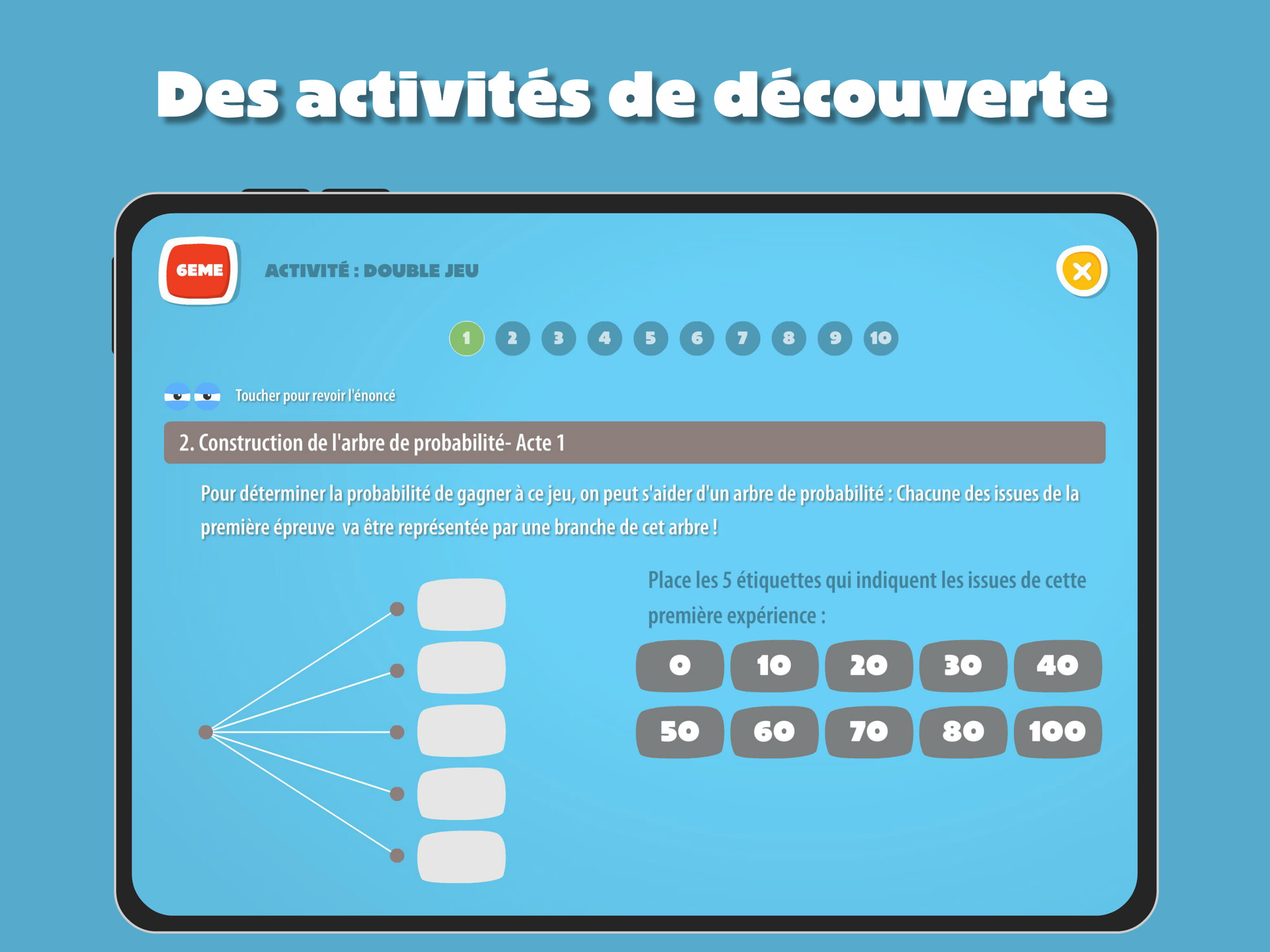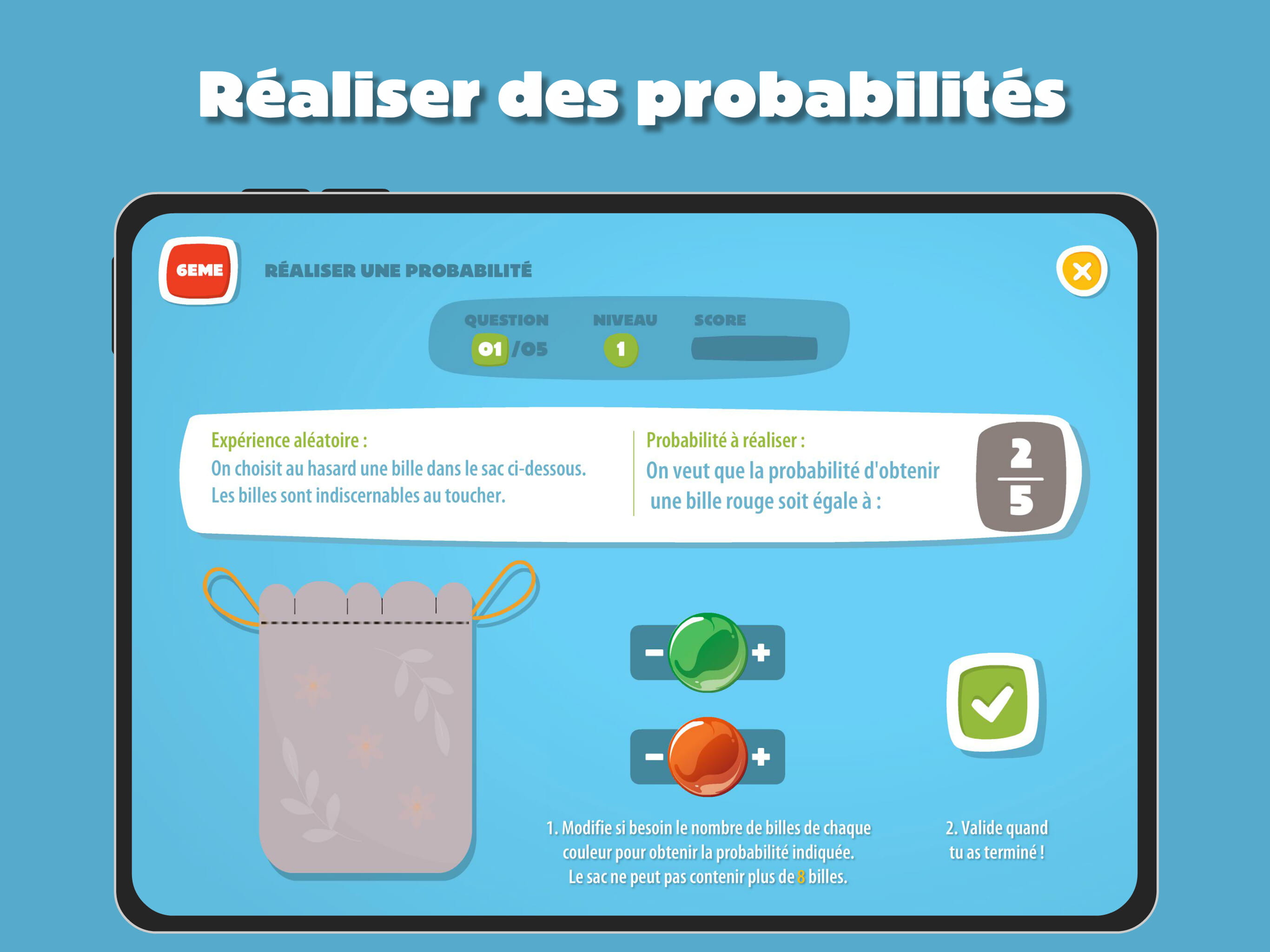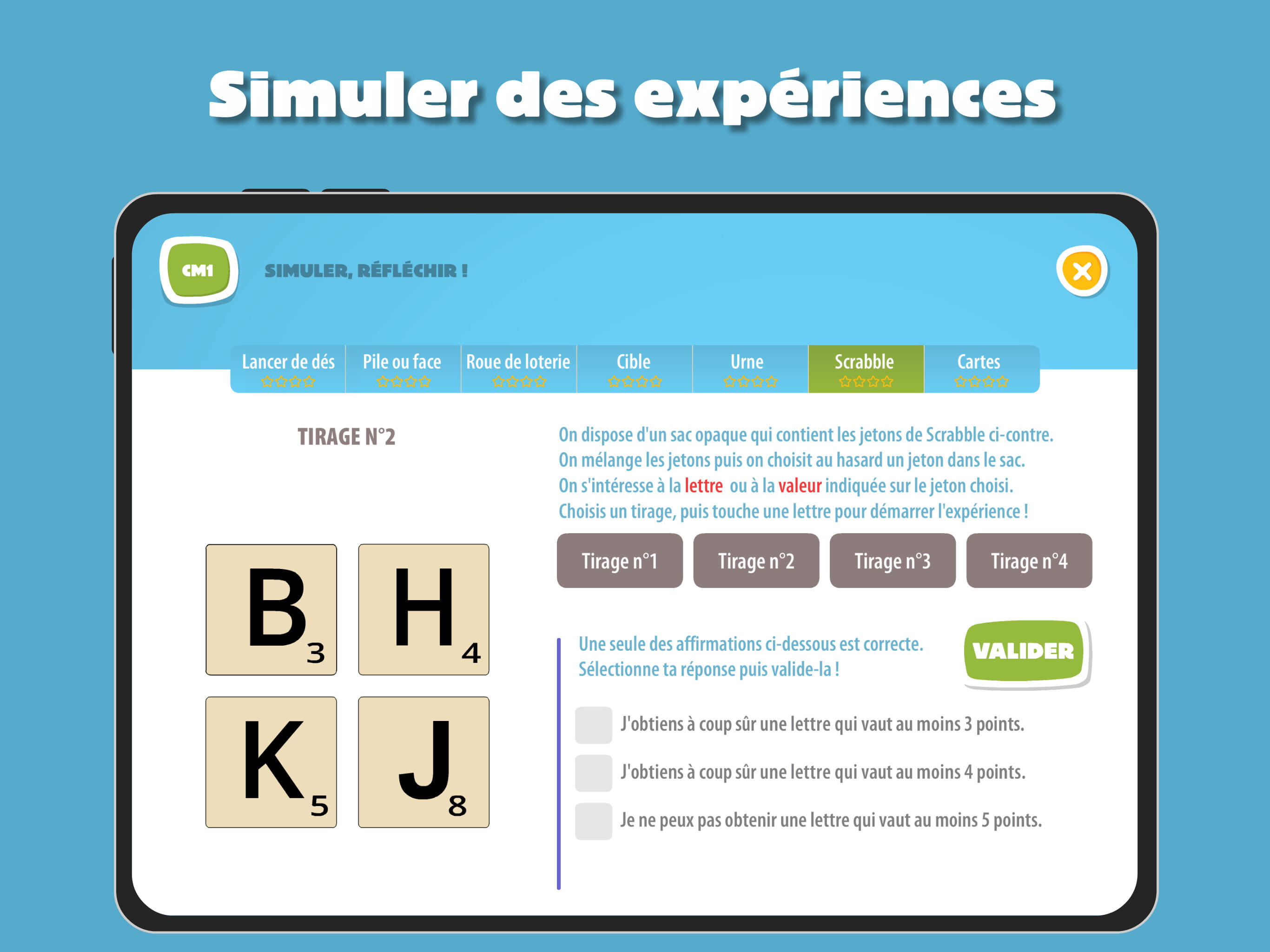 Aléa est une application qui permet de travailler les probabilités au cycle 3, de façon progressive.
