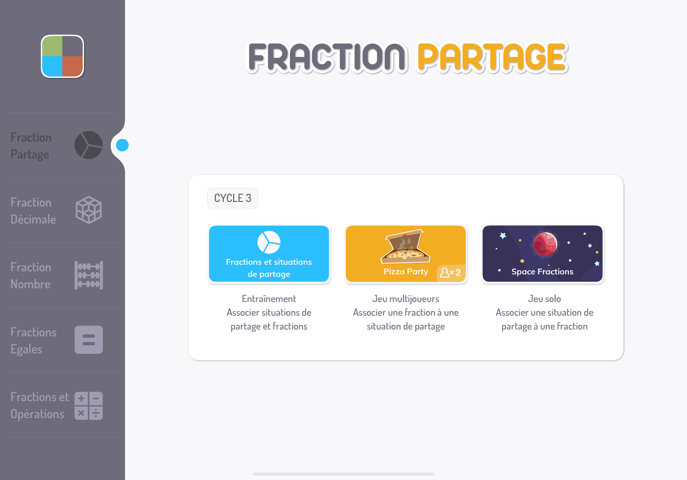 Fractions Express est une application sur les fractions pour les cycles 3 et 4. Constituée de 23 exercices paramétrables et de 9 jeux, elle permet de balayer l'ensemble des connaissances et savoir-faire sur les fractions.