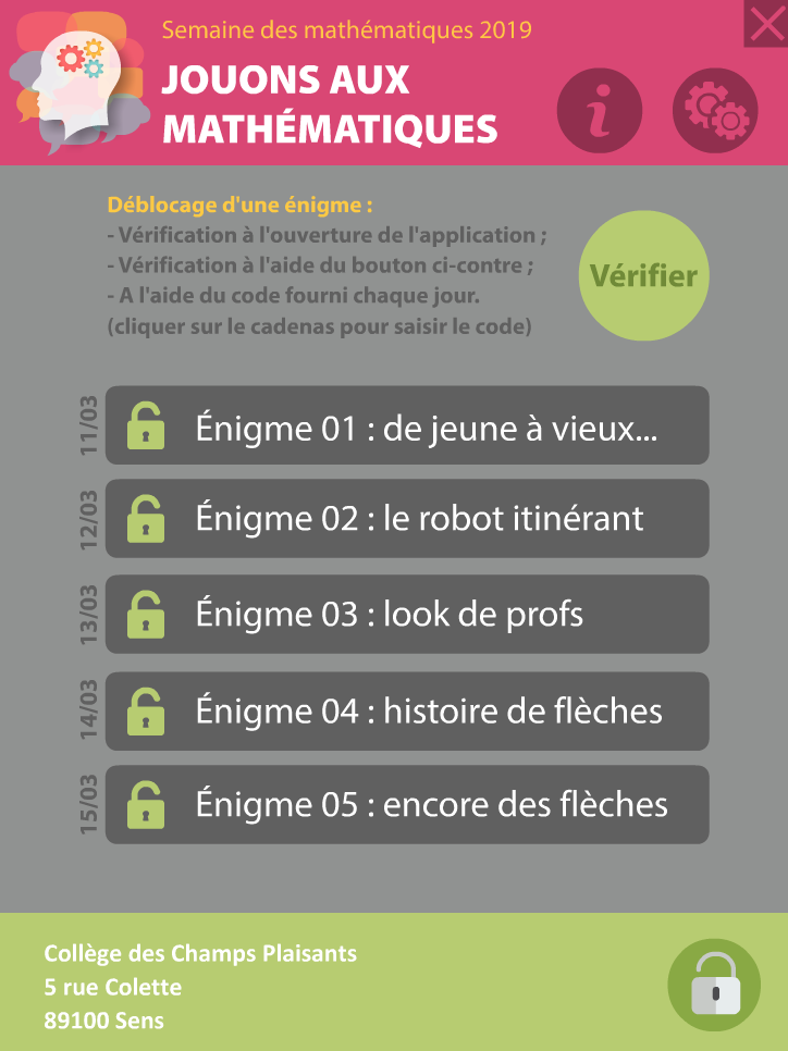 Les dates étant passées, les énigmes se déverouillent automatiquement à l'ouverture de l'application. Si l'appareil n'est pas connecté à internet, vous pouvez utiliser le code "QsDgZ19" qui déverrouille les 5 énigmes.