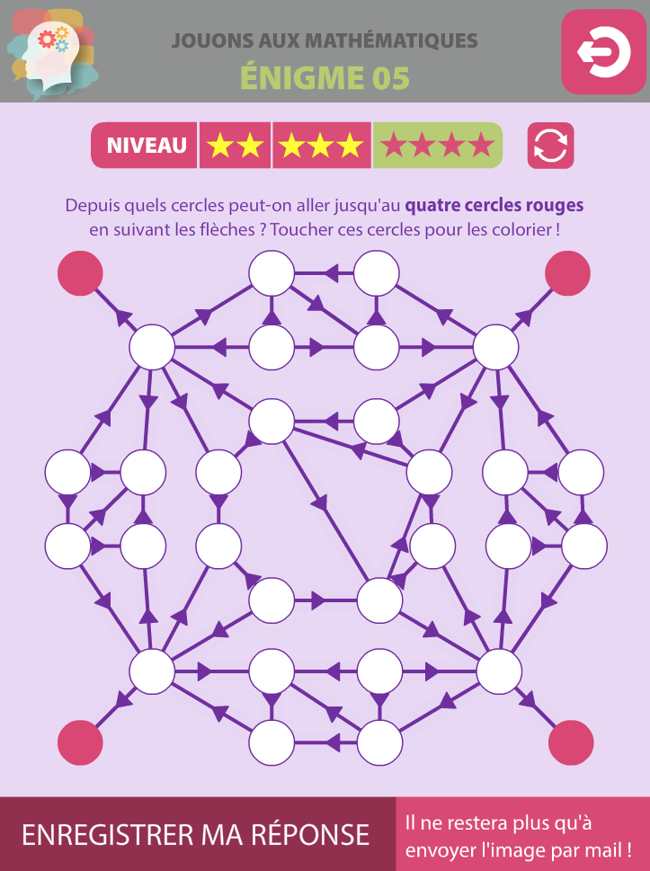 Cinq énigmes à résoudre, de difficulté croissante, déclinées chacune en 3 niveaux. Les réponses, sous forme de captures d'écran, sont à envoyer au professeur référent de l'action (qui n'est pas l'auteur de l'application !).